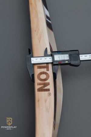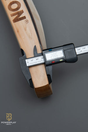 This bat features a full profile design with edges measuring over 41 mm and a toe thickness exceeding 28 mm, providing strong presence and stability through the hitting zone. The profile supports controlled power without compromising pick-up.